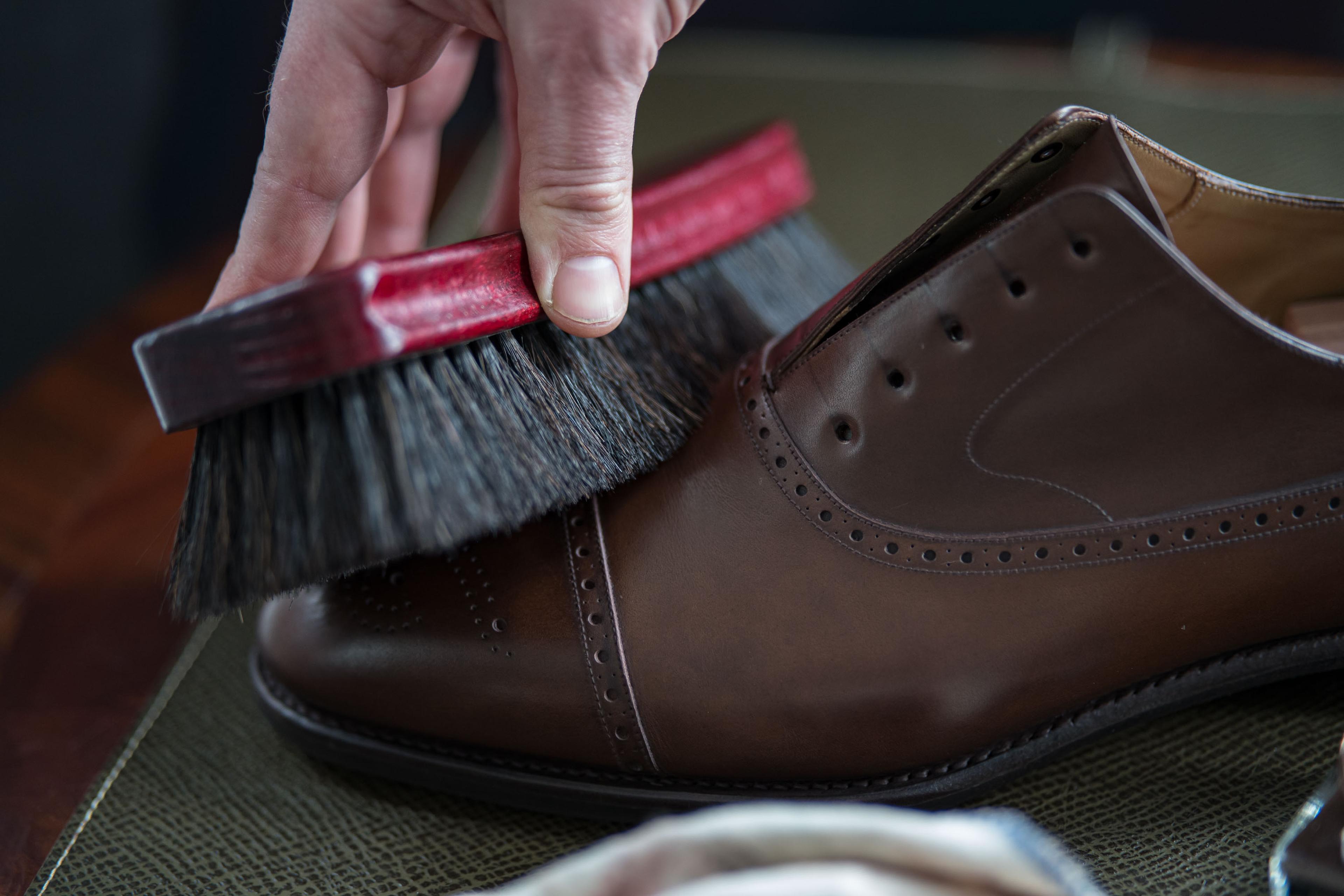 Låt skon vila 5-10 minuter och borsta bort överflöd och ta fram glansen med en skoborste med hästtagel. Om skorna har mycket märken eller inte vårdats på länge och har torrt läder kan du lägga på 1-2 lager till enligt samma procedur. Önskas högre glans kompletterar man med fördel sedan med Saphir Pate de Luxe vax som ger den sista glänsande finishen och ytterligare skydd.